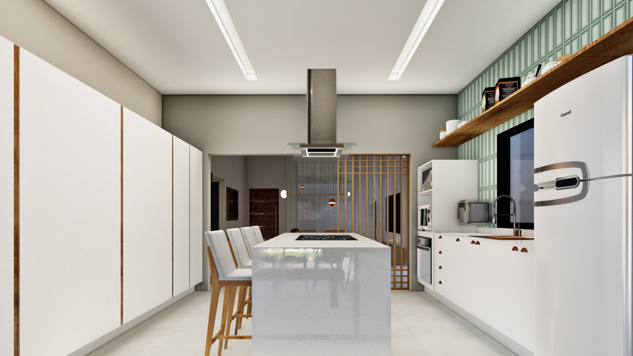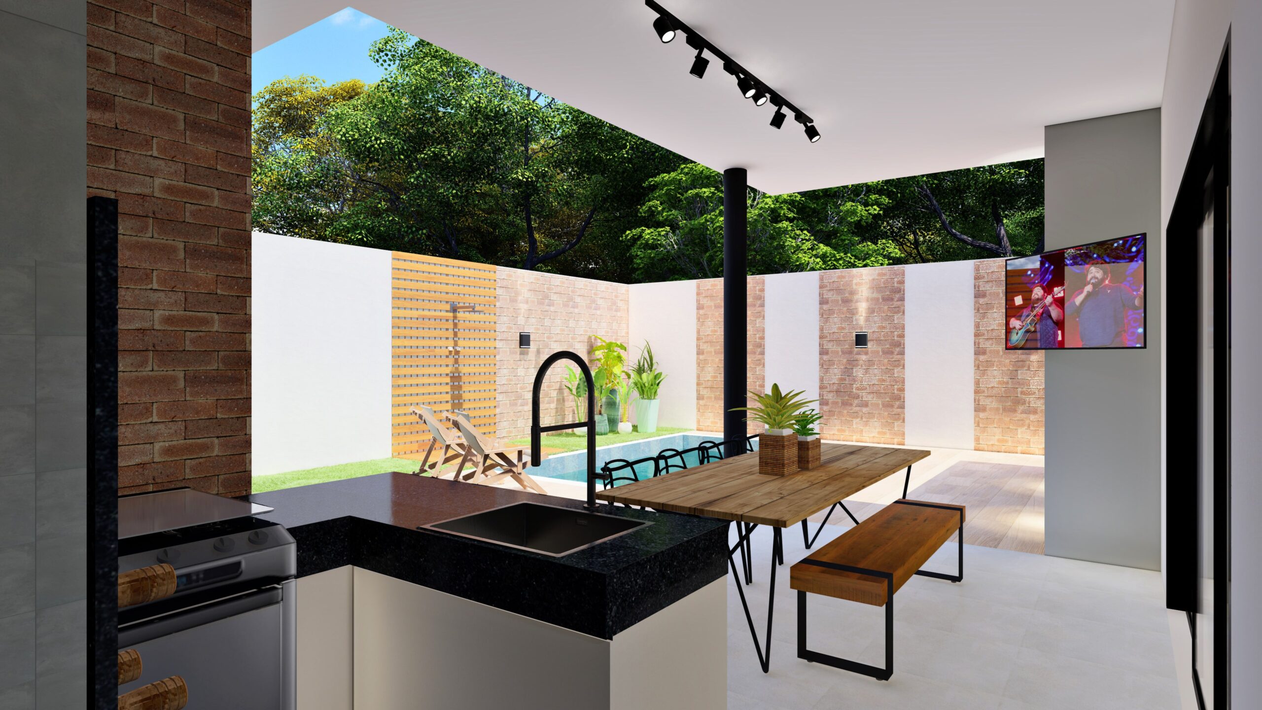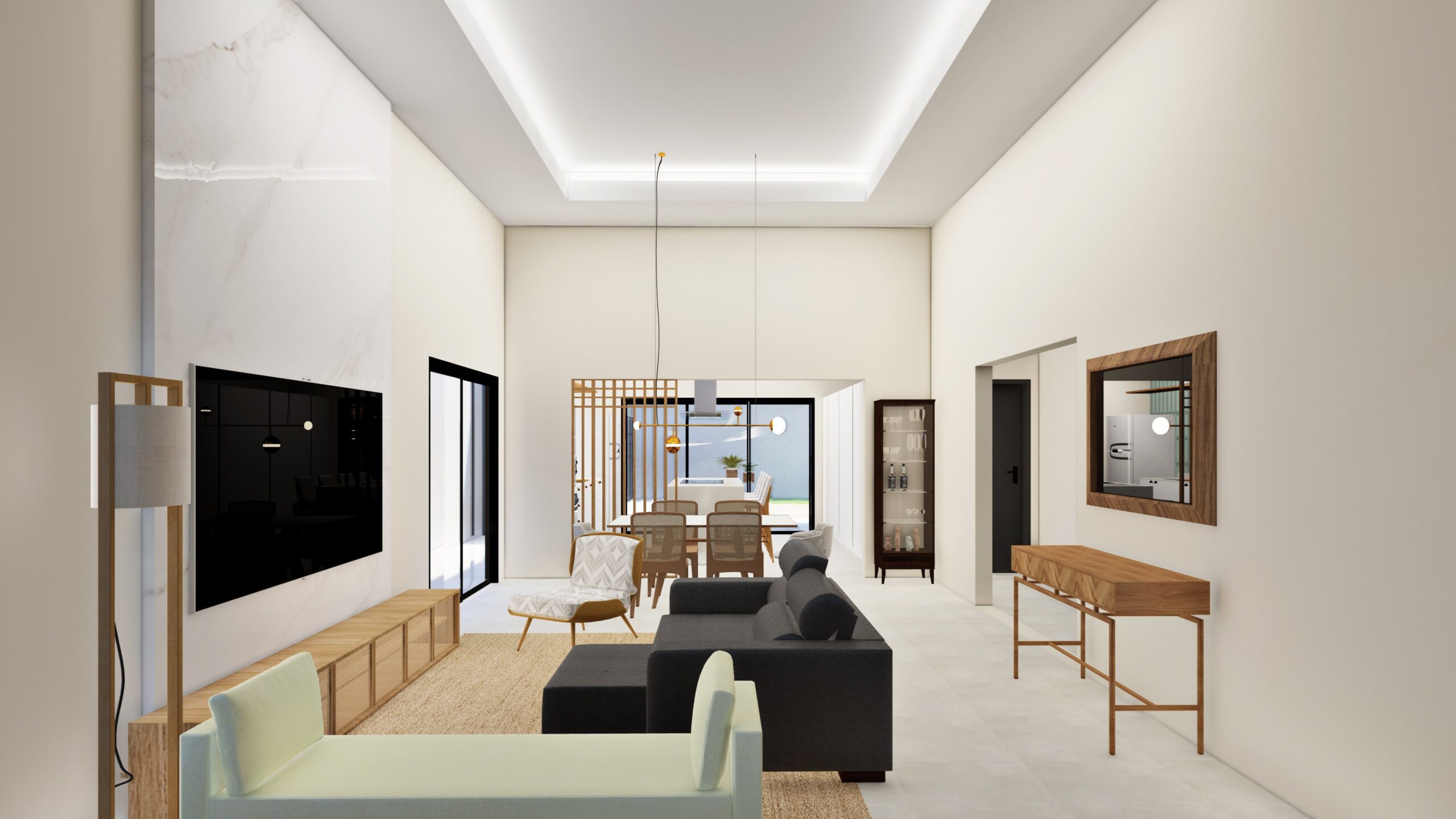 Casa terrea. Contém garagem para dois carros, sala com pé direito mais alto, cozinha, area de lazer externa com piscina, dois quartos, banheiro social e uma suíte.
