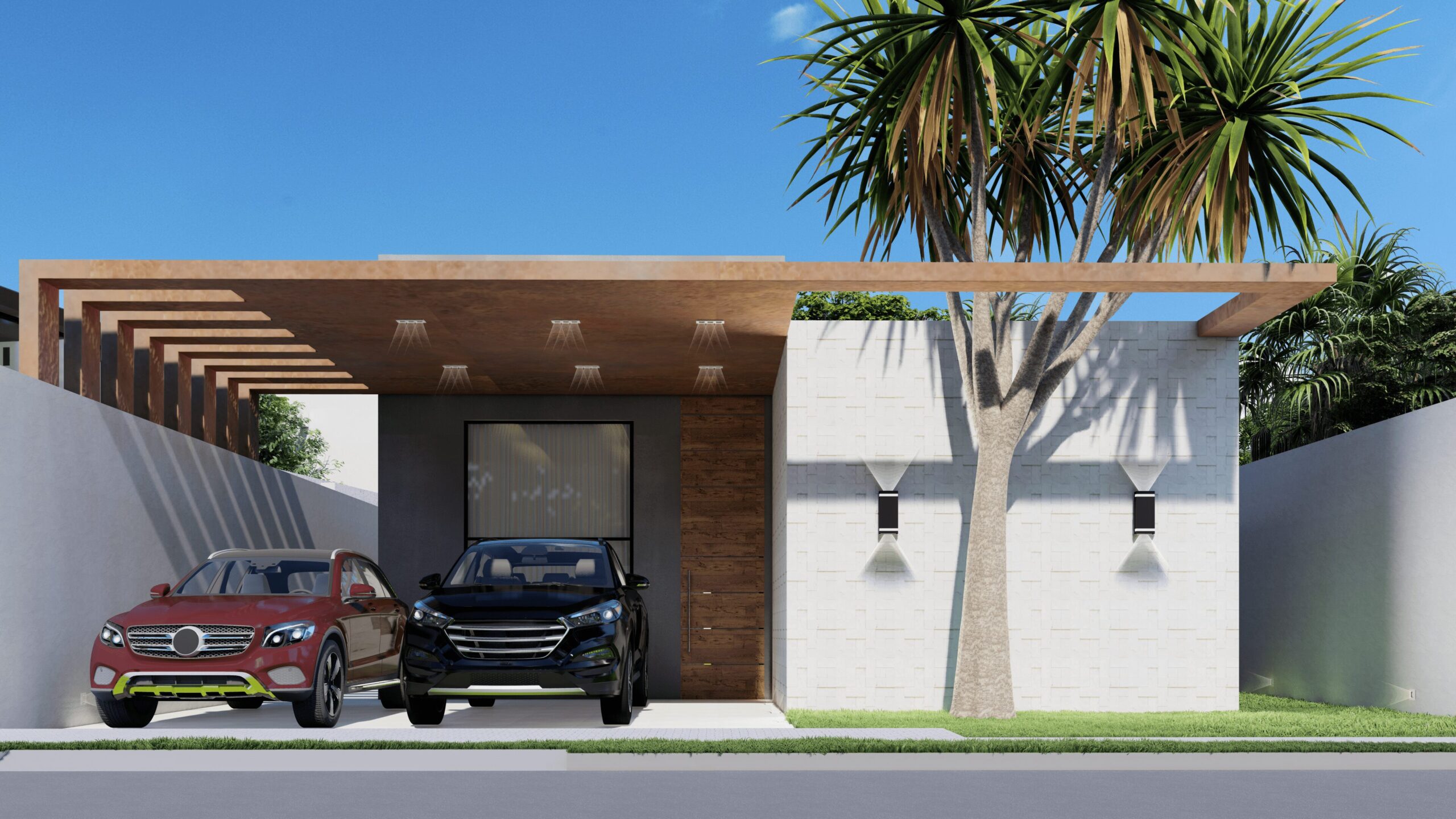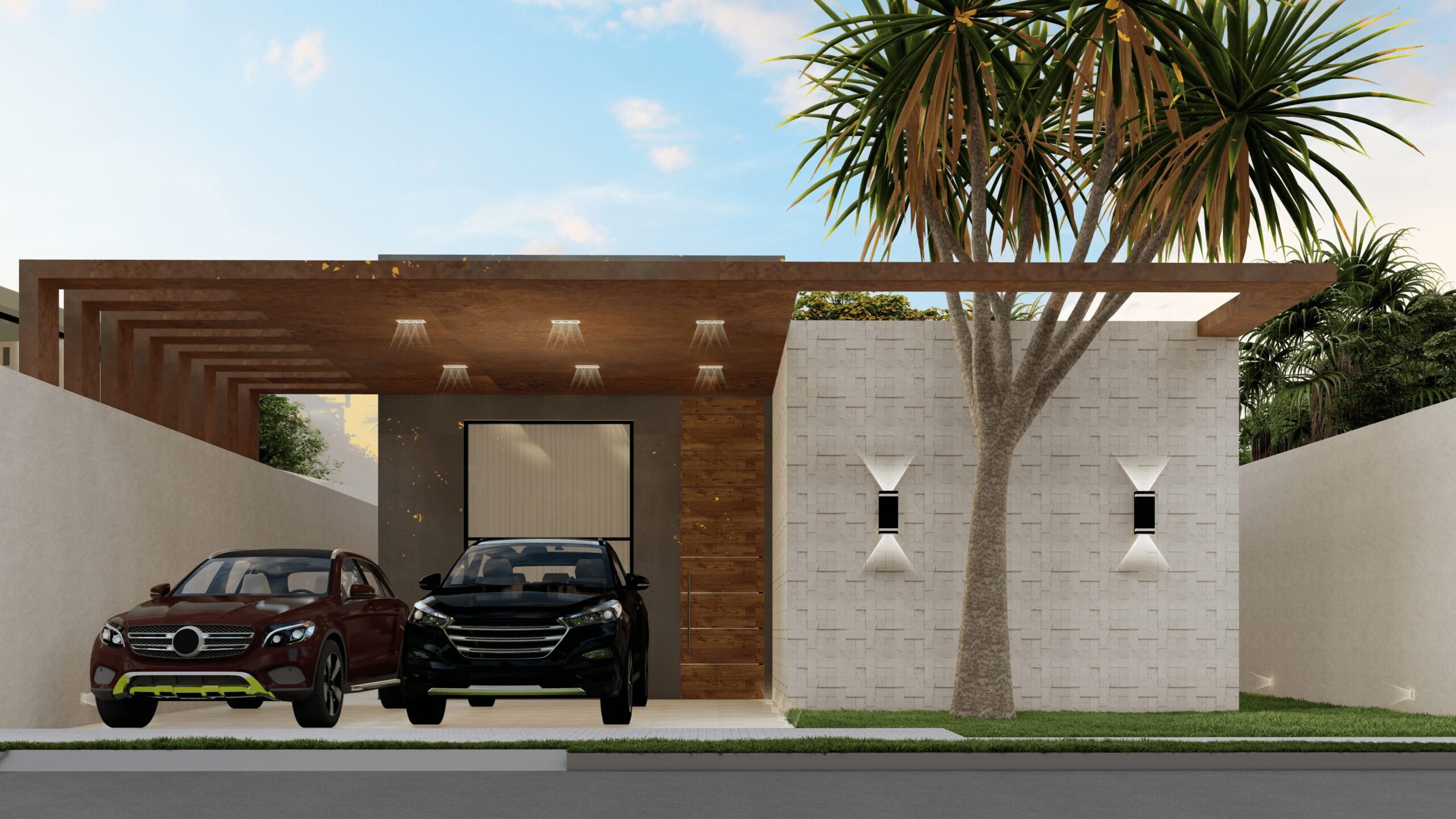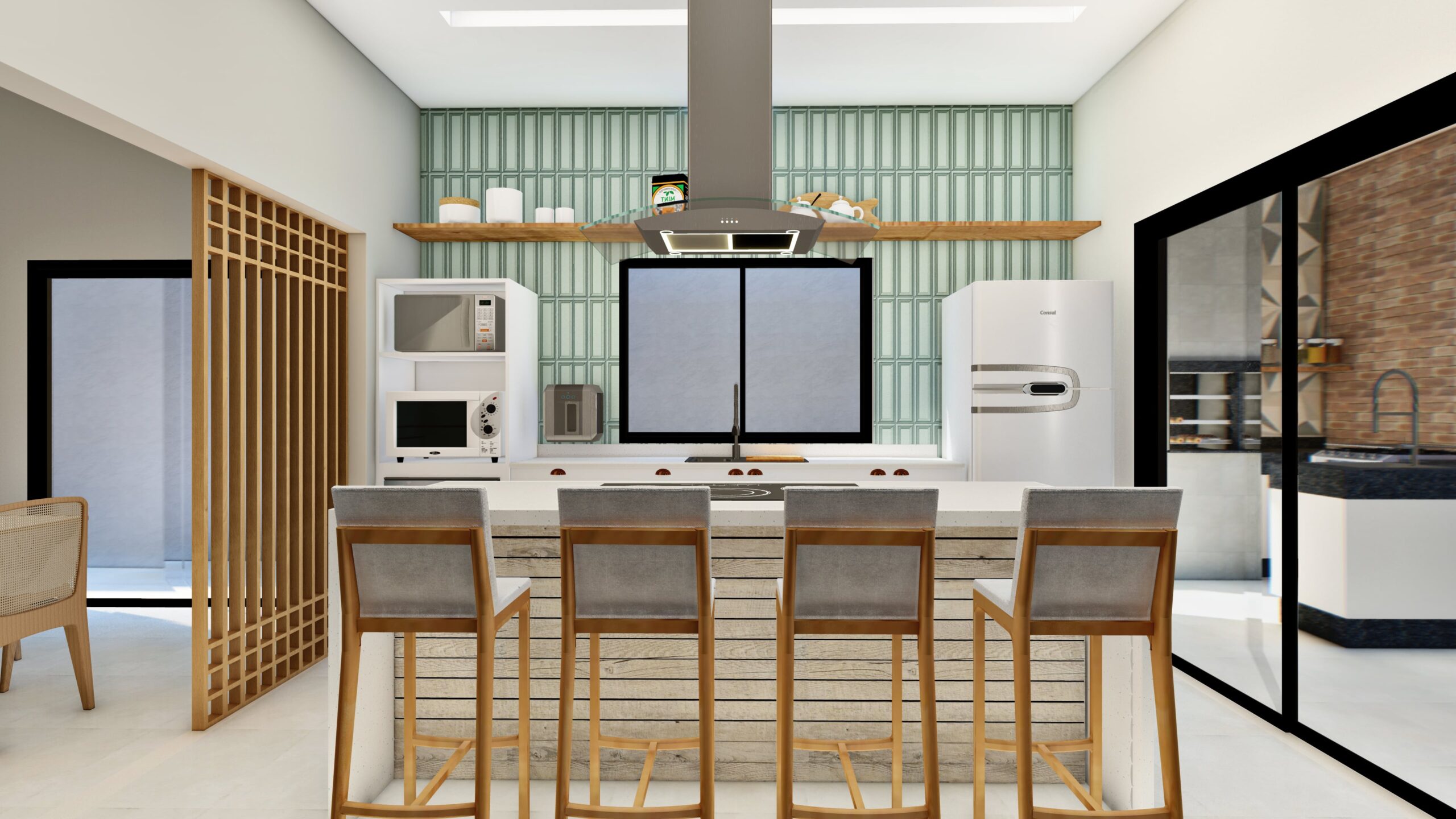 Casa terrea. Contém garagem para dois carros, sala com pé direito mais alto, cozinha, area de lazer externa com piscina, dois quartos, banheiro social e uma suíte.