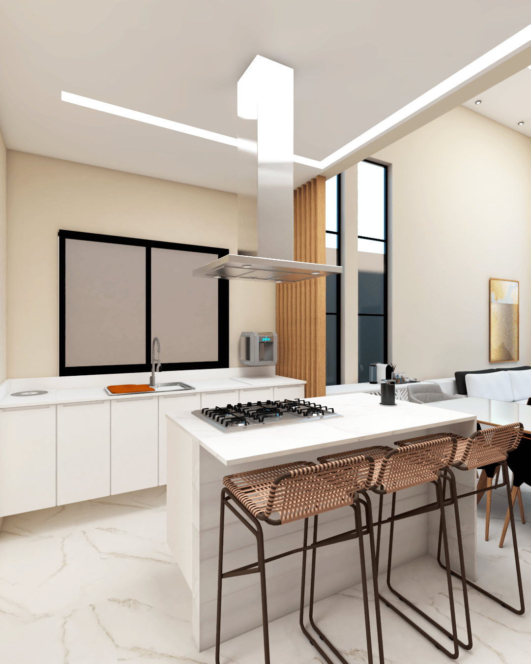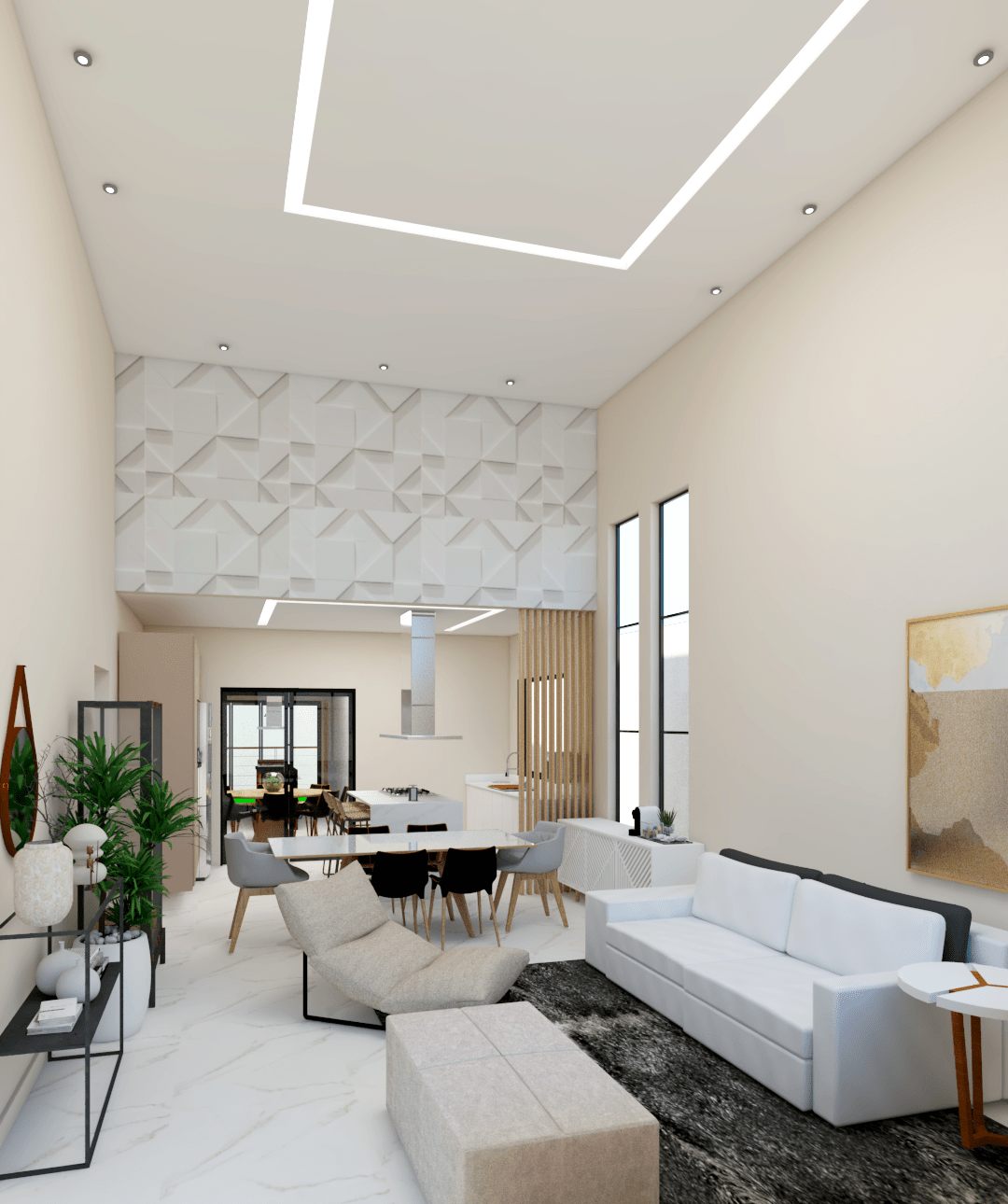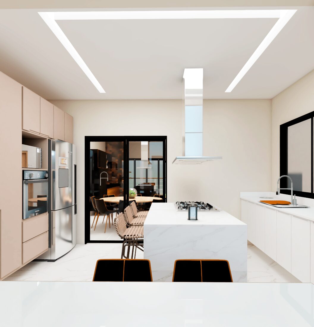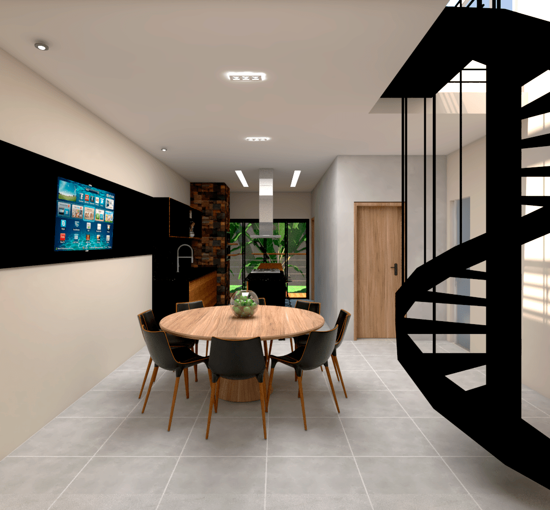 Projeto de interiores para uma casa terrea. Sala com pe direito duplo e cozinha integrada. Área de lazer totalmente fechada.