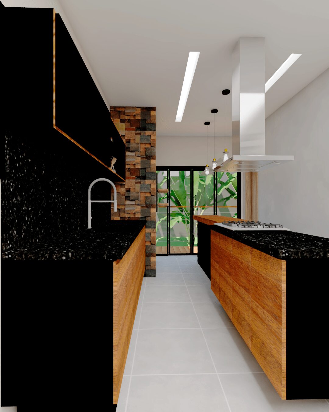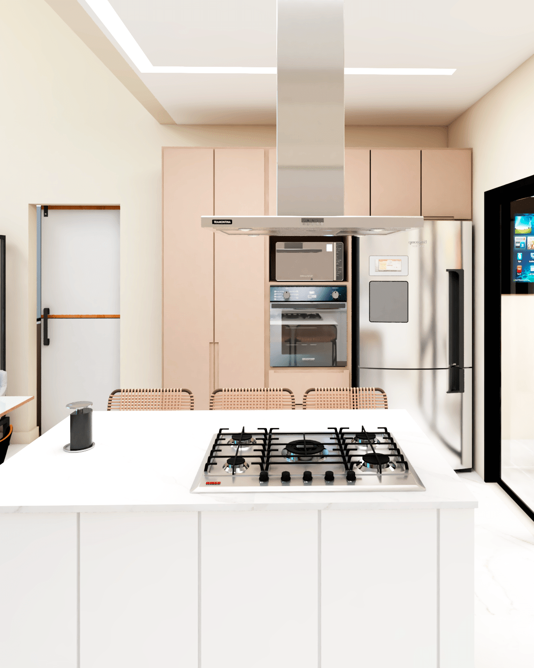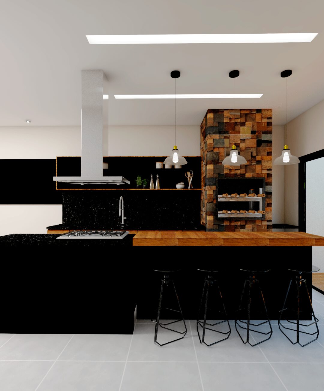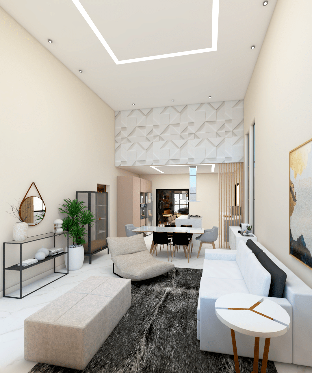 Projeto de interiores para uma casa terrea. Sala com pe direito duplo e cozinha integrada. Área de lazer totalmente fechada.