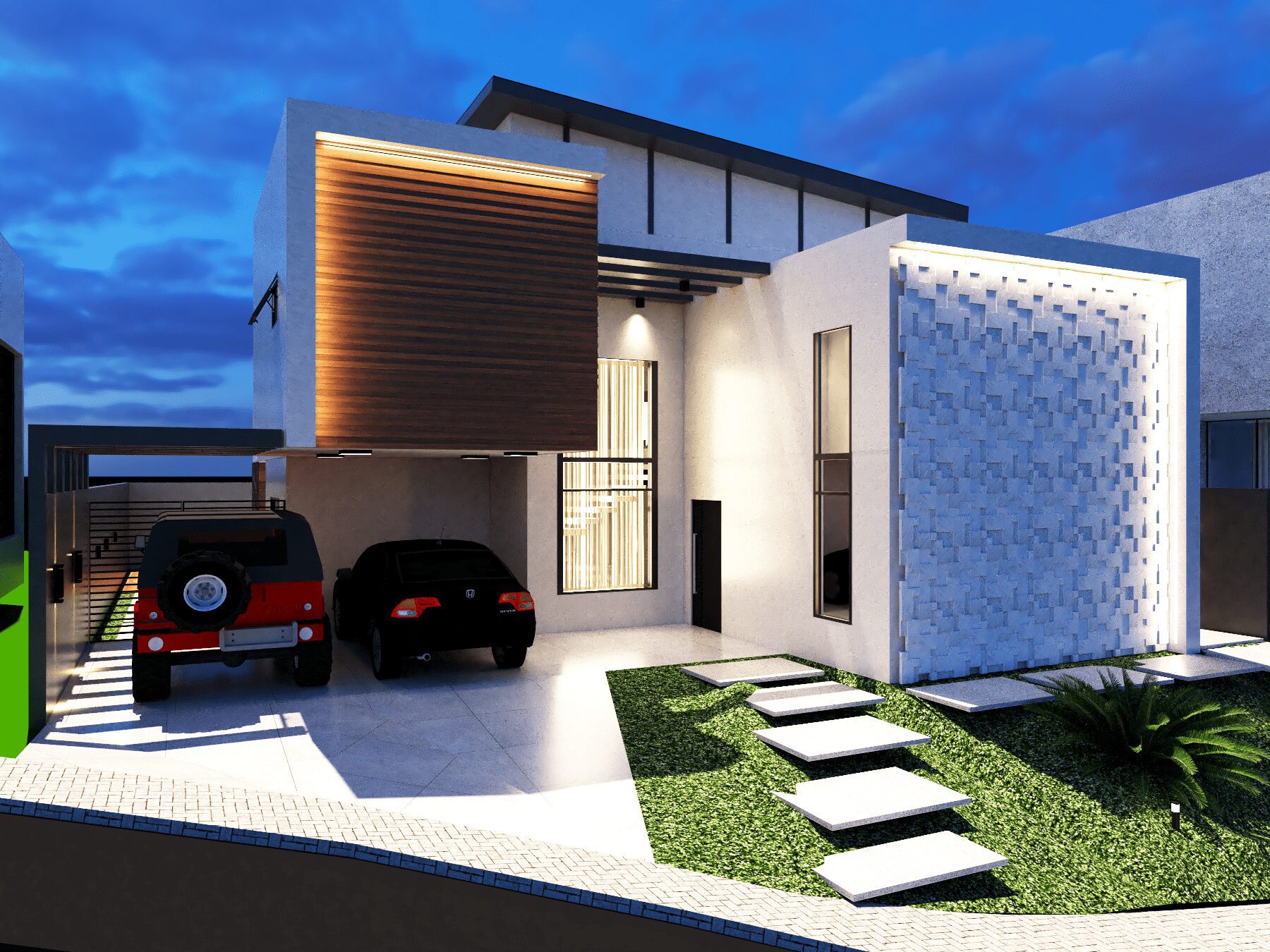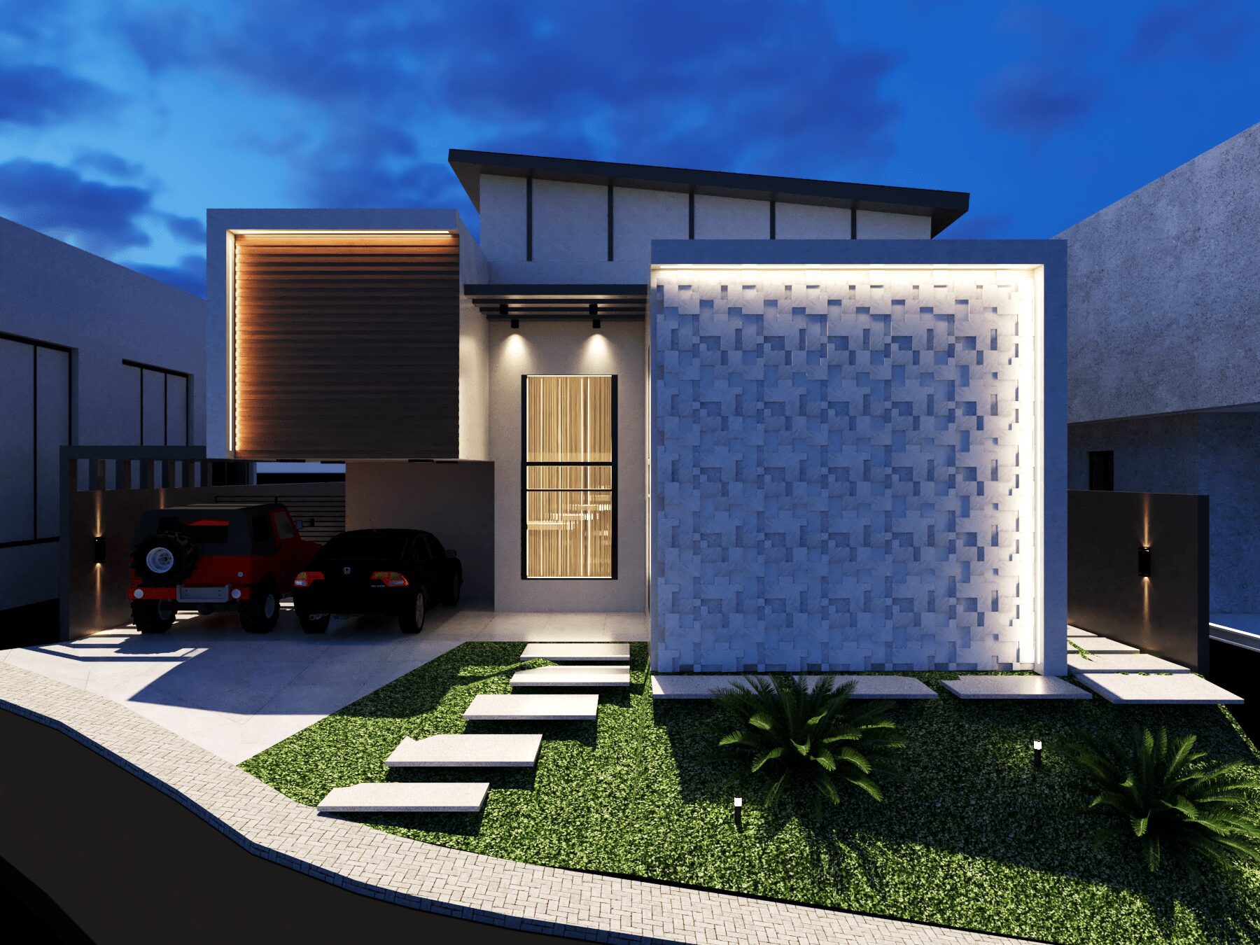 Projeto de interiores para uma casa terrea. Sala com pe direito duplo e cozinha integrada.