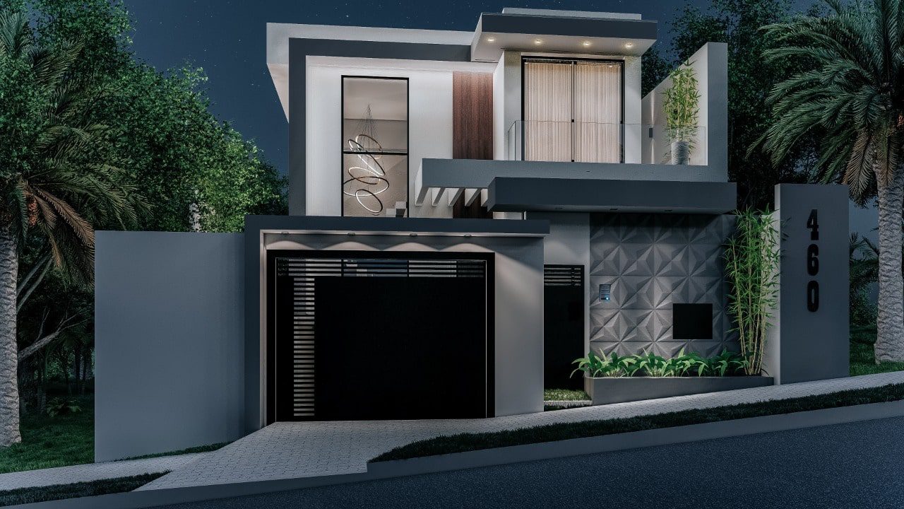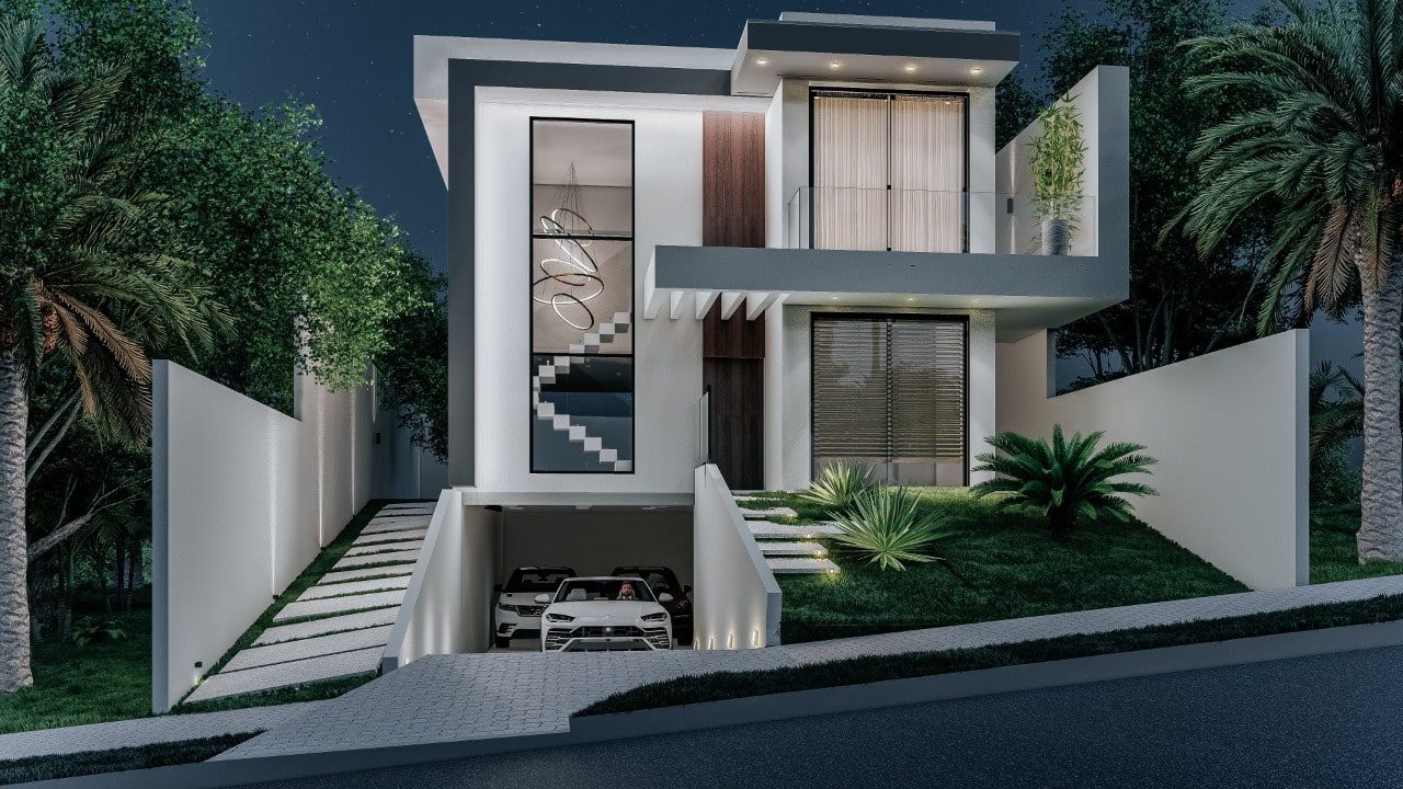 Casa em terreno declive, com dois andares com garagem embaixo, aproveitando melhor o terreno.