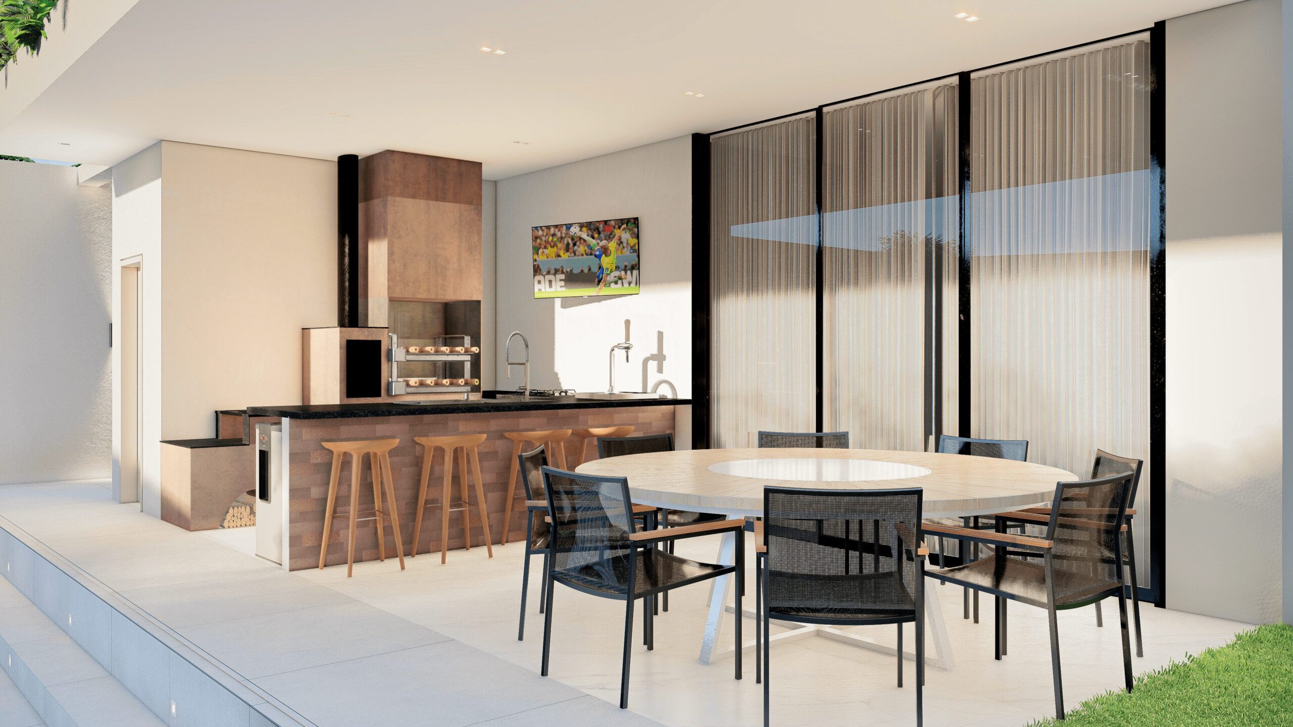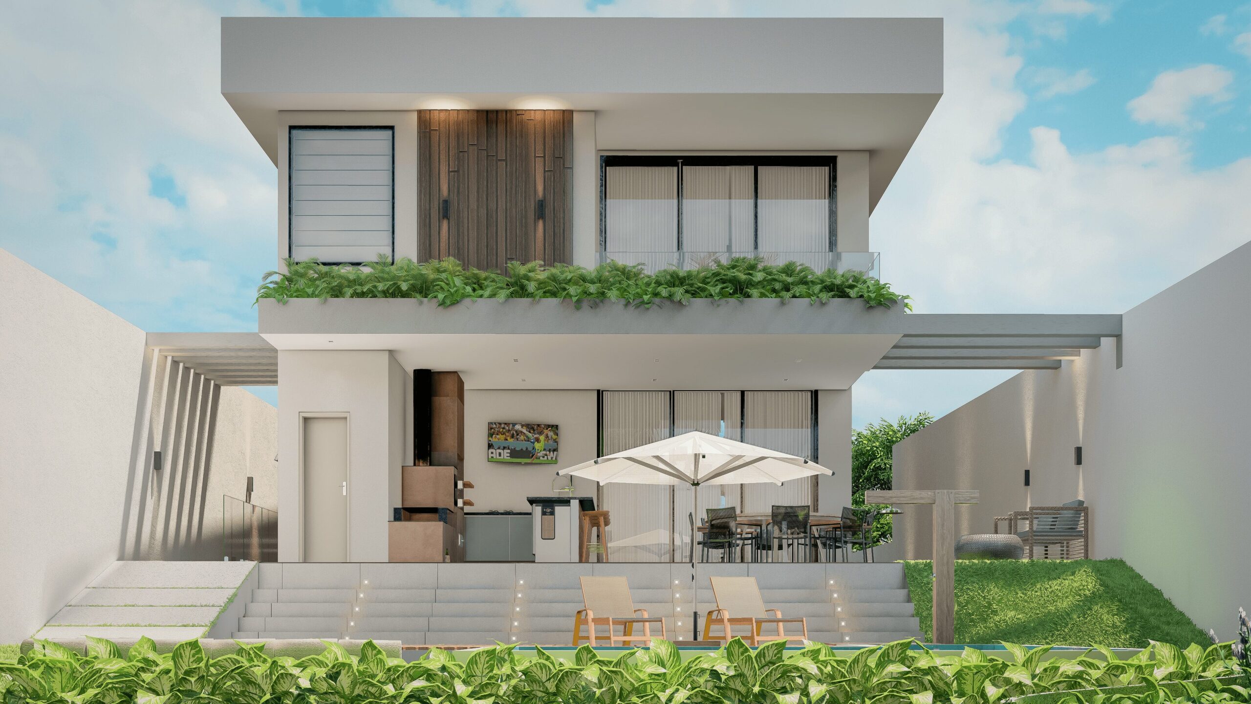 Contém garagem para dois carros, escritório com wc, sala e cozinha integradas, área de lazer externa com piscina e fogo de chão.